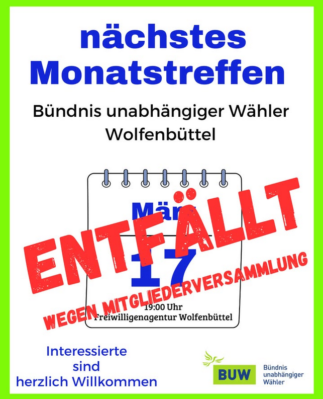 Das monatliche Treffen des BUW Wolfenbüttel im Mitgestaltungspunkt der Freiwilligenagentur Wolfenbüttel entfällt.