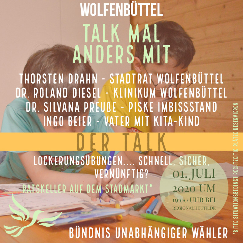Am 01. Juli 2020 um 19 Uhr startet die zweite Veranstaltungdes vom Bündnis unabhängiger Wähler ins Leben gerufene Talkshowformat.