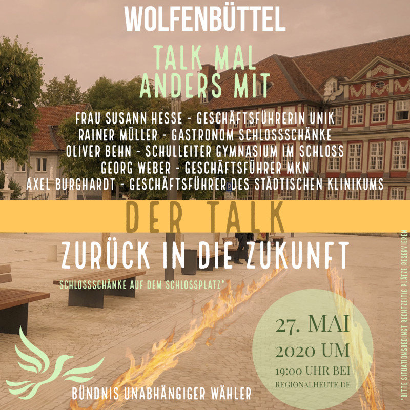 Aufgrund der aktuellen Situation wird die Veranstaltung live im Internet übertragen. Beginn ist am 27. Mai um 19 Uhr. Den Übertragungslink finden Sie auf der Homepage des Bündnisses ( www.waehlergemeinschaft-wf.de ).